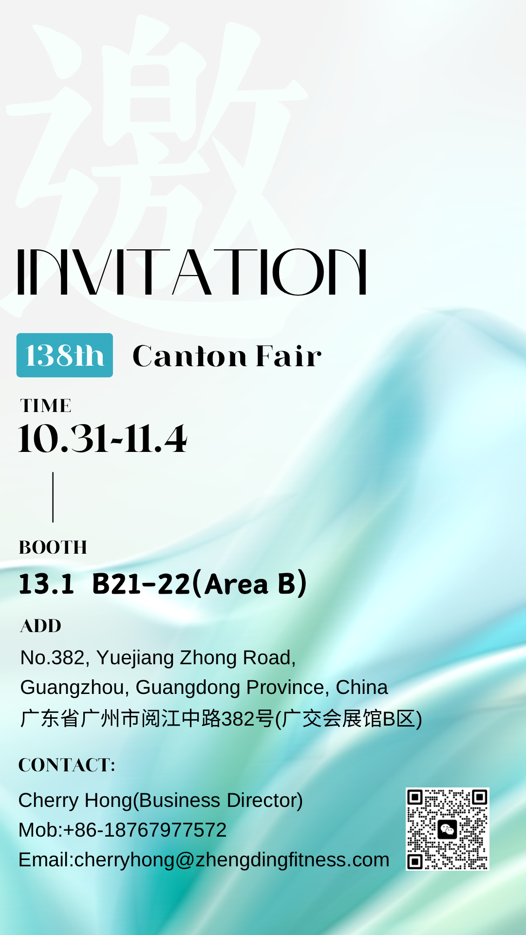 Zhejiang Zhengding Industry & Trade Co., Ltd. is pleased to announce its participation in the 138th China Import and Export Fair (Canton Fair), which will take place from October 31 to November 4, 2025, at the China Import and Export Fair Complex in Guangzhou, Guangdong Province. The company welcomes visitors to Booth No. 13.1 B21-22 (Area B) to explore its range of fitness and wellness equipment.